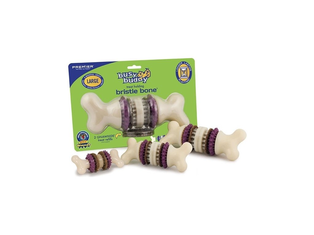 Zábavná hračka pro pejsky středníchch plemen v podobě míčku na kosti. Kost je z tvrdého odolného nylonu a míček z měkké gumy, který láká pejsky ke kousání. Kousání hračky psa zabaví a zároveň pomáhá udržovat zdravé zuby a dásně. Kost můžete použít i pro společné chvíle například pro aportování. Na hračku lze navíc navléct dva pamlsky, které psa zabaví ještě lépe! Šest kusů pamlsků je součástí balení, další je možné dokoupit.
