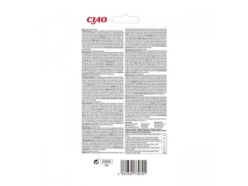 Složení: tuňák 26,3 %, kuře, losos 1,8 %, tapioka (sušená), výtažek z tuňáka 0,6 %, uhličitan vápenatý, chlorid draselný, síran hořečnatý heptahydrát.