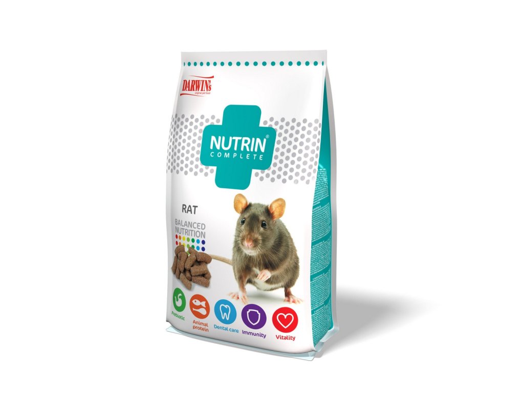 Krmivo Nutrin Complete Rat je kompletní extrudované krmivo vhodné pro potkany. Krmivo obsahuje živočišné proteiny, které musí být nedílnou součástí stravy všežravých hlodavců. Živočišná složka je nepostradatelná a potřebná ke správnému vývoji jedince, též předchází možnému výskytu kanibalismu. Složení je obohaceno o prebiotika a komplex vitaminů a minerálů, které působí příznivě na imunitní funkce organismu. Granule mají jednotný tvar, který zajišťuje stejný obsah živin a eliminuje tak případné vybírání chutnějších kousků. Speciální textura granulí a obsah vlákniny navíc pečuje o chrup a zajišťuje obrus zubů.