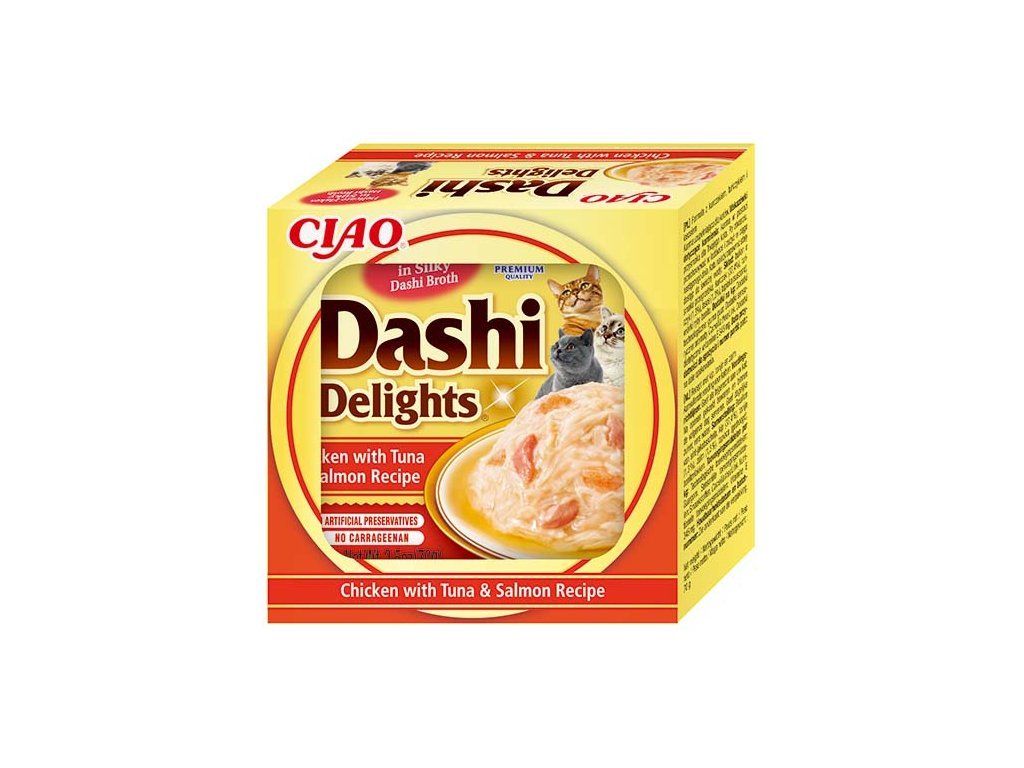 Kuřecí maso, tuňák, losos a jemné tuňákové vločky v lahodném vývaru Dashi. Dashi je tradiční japonský rybí vývar z tuňákových vloček, který je známý svou vyjímečnou, lahodnou chutí. Zařazení Dashi do jídelníčku vaší kočky může dodat krmení nový rozměr a učinit ho vyjímečným zážitkem.