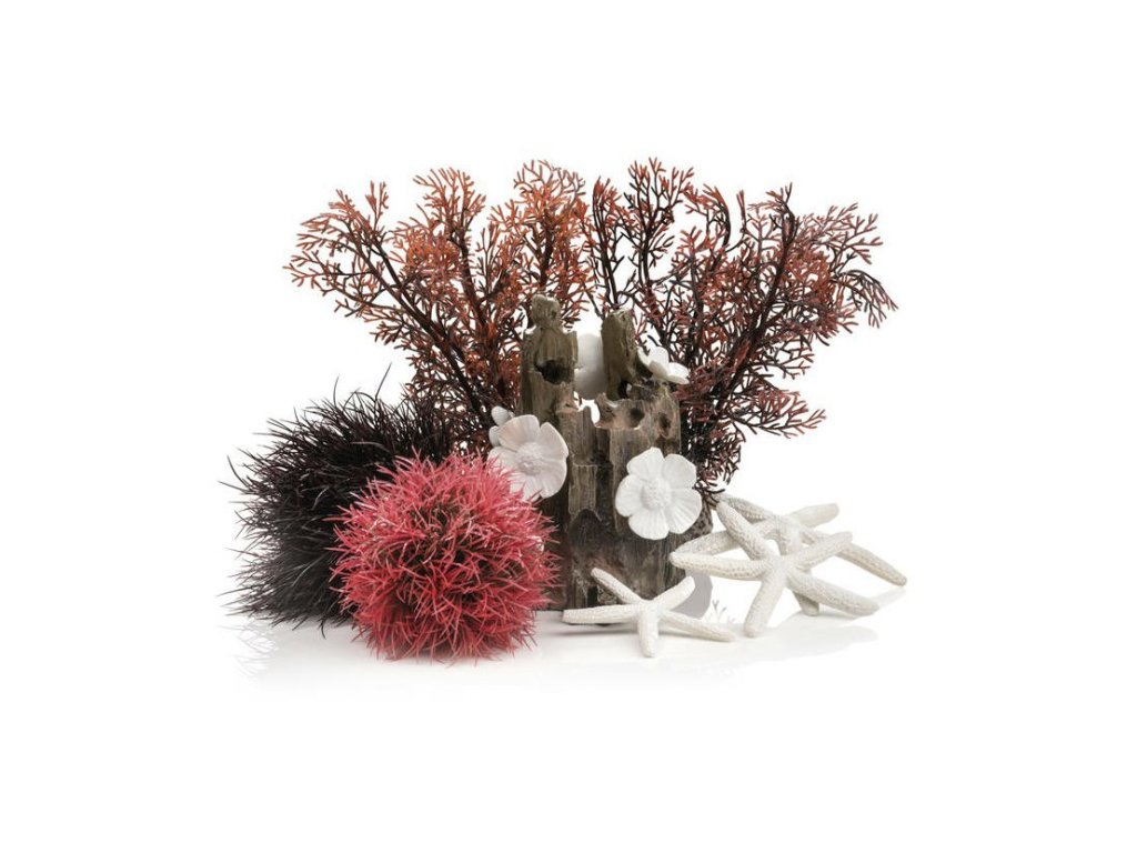 BIORB set Červený les obsahuje: 1 x BIORB dekorace dřevo s květy malé, 1 x BIORB set 3 bílé hvězdice, 1 x BIORB imitace mořského korálu 20 cm, 1 x BIORB dekorace červený míč, 1 x BIORB mořská lilie.