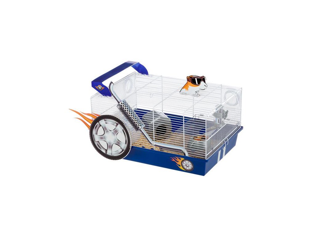 Klec pro drobné hlodavce s motivem dragster. Odolné chovné zařízení vyrobené ze zdravotně nezávadného plastu a robustního drátěného pletiva.