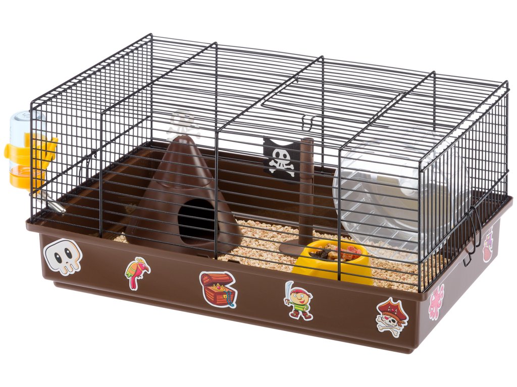Klec CRICETI 9 PIRATES pro křečky a drobné hlodavce je vyrobena z pevného drátěného pletiva ošetřeného odolným lakem s hnědou plastovou základnou. Použitý plast je zdravotně nezávadný. Součástí klece je pirátská výbava. Rozměry: 46 x 29,5 x 23 cm.