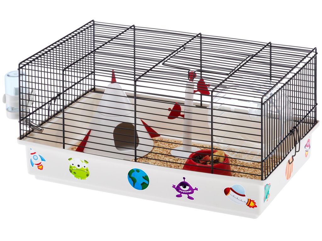 Klec CRICETI 9 SPACE určená pro křečky, myši a další malé hlodavce je vyrobena z pevného drátěného pletiva ošetřeného odolným lakem se základnou ze zdravotně nezávadného plastu. Součástí klece je výbava, jejíž součástí je domeček ve tvaru raketoplánu. Rozměry 29,5 x 23 x 46 cm. V horní části klece CRICETI 9 SPACE jsou malá dvířka, která mohou být použita pro normální úklid a čištění. Jsou vybavena bezpečnostní sponou, aby se váš mazlíček nemohl náhodně dostat ven. Pro hloubkové čištění stačí uvolnit klipy na stranách a pak lze snadno oddělit základnu od horního dílu. Součástí výbavy je domek ve tvaru raketoplánu, miska na krmivo, napáječka, plastový kolotoč, dekorační anténa a vesmírné samolepky.