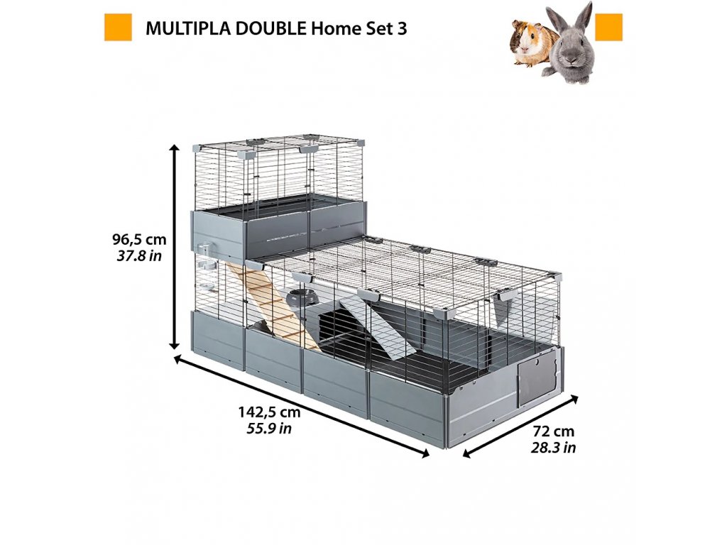 Multipla Double je prostorná, dvoupatrová klec pro chov středně velkých hlodavců. Ke kleci je možné přikoupit dvě rozšiřující sady a celý obytný prostor tak výrazně zvětšit. Klec obsahuje bohaté příslušenství. Ve spodním patře najdeme domeček, žebřík, misku na jídlo, krmítko na seno a láhev na pití. Horní část je zabezpečena sítí, která je zcela odnímatelná pro snadný přístup a údržbu. Klec je obohacená o posuvná dvířka, která umožňují snadný výstup a vstup zvířete. Klec se snadno montuje, není potřeba žádné speciální nářadí. Je vyrobena z ekologicky udržitelných materiálů.