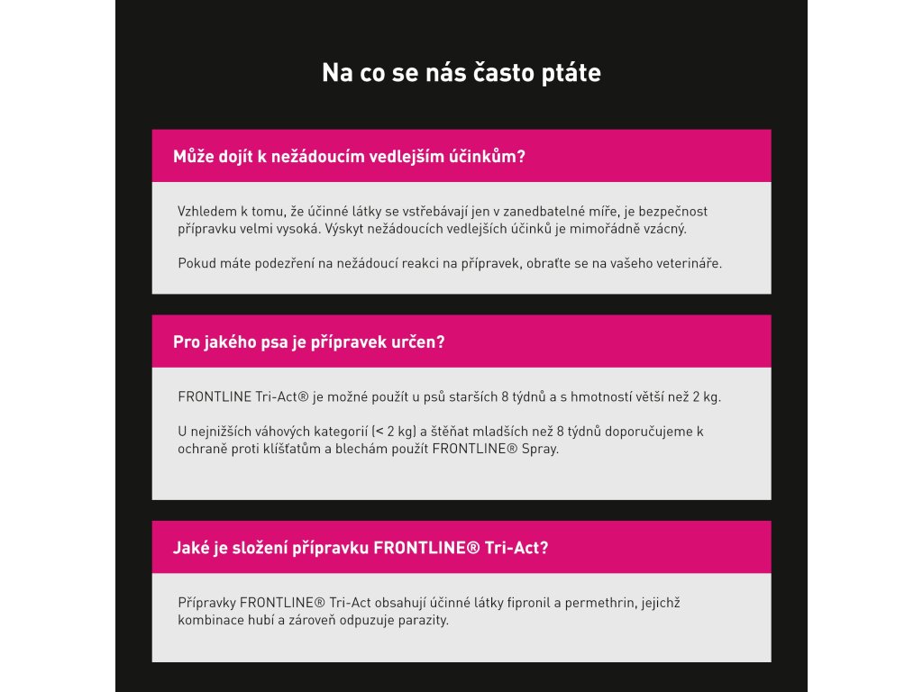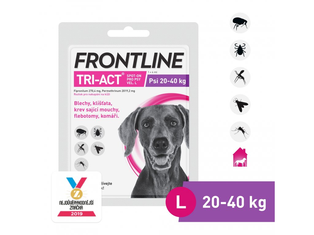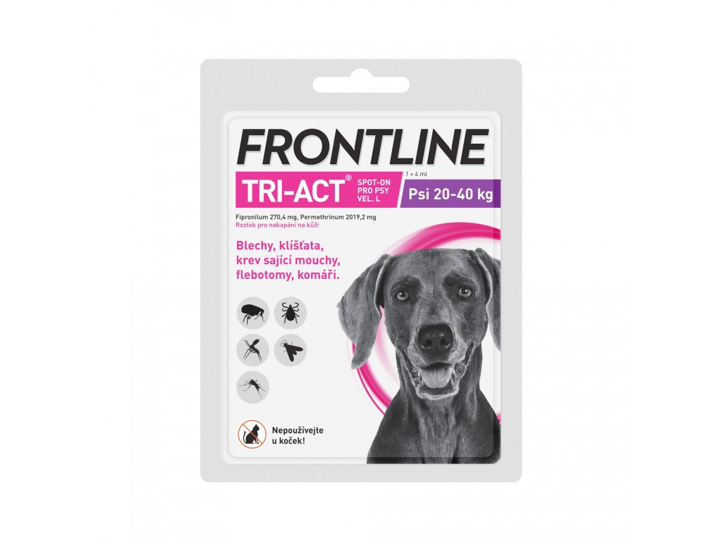 Roztok Frontline TRI-ACT obsahuje dvě účinné látky Fipronilum 270,4 mg, Permethrinum 2019,2 mg v pipetě 4 ml, které brání před napadením blechami, klíšťaty a mají repelentní účinky proti flebotům, mouchám, které sají krev a komárům. Přípravek usmrcuje blechy během 24 hodin. Jedno ošetření brání dalšímu napadení po dobu 4 týdnů. Přípravek může být použit jako součást strategie léčby alergie na bleší kousnutí, která byla předem diagnostikována veterinárním lékařem. Přípravek má repelentní účinek proti klíšťatům od 7 dnů až do 4 týdnů po ošetření. Může však dojít k přichycení jednotlivých klíšťat, která odpadnou během prvních 24 hodin po napadení.