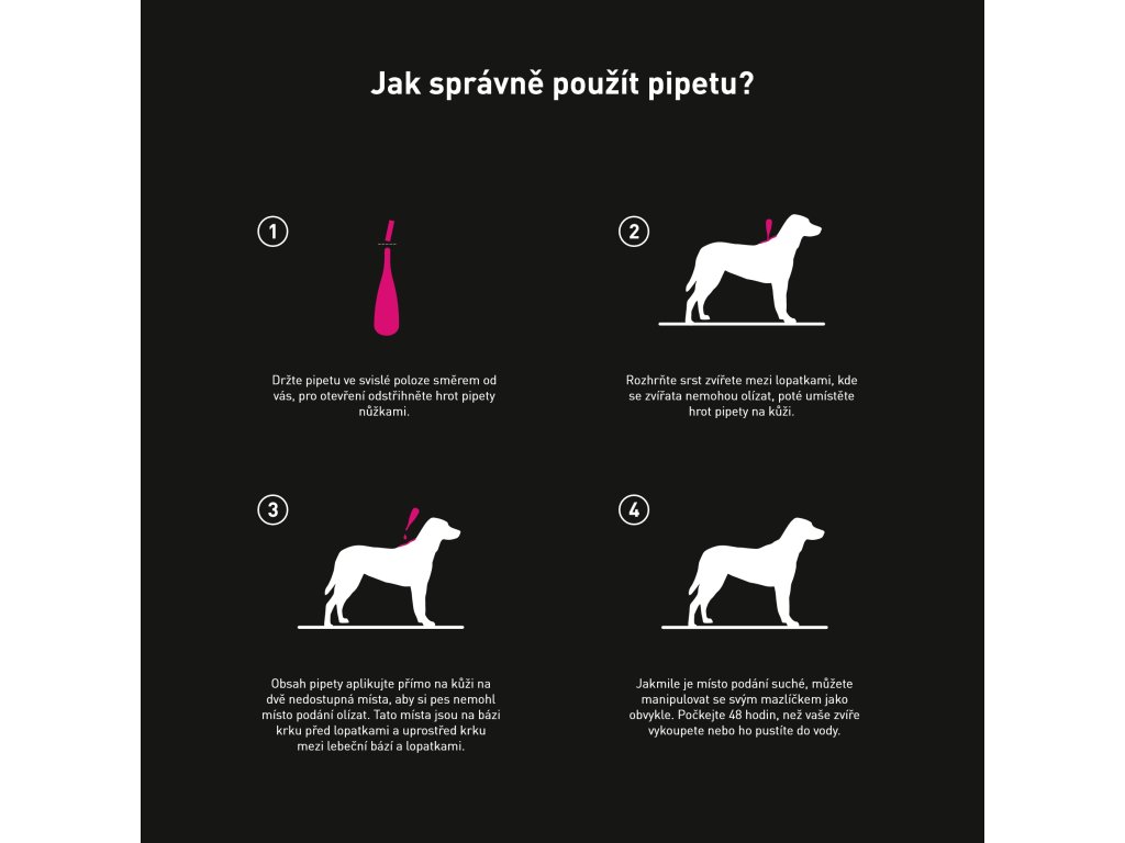 Aplikace: Vyberte vhodnou velikost pipety podle hmotnosti psa. Pro psy nad 60 kg použijte vhodnou kombinaci dvou velikostí pipet tak, aby co nejvíce odpovídaly živé hmotnosti. Přípravek by měl být aplikován na dvě nedostupná místa, aby si pes nemohl místo podání olízat. Tato místa jsou na bázi krku před lopatkami a uprostřed krku mezi lebeční bází a lopatkami. Zevně na kůži. Rozhrňte srst na zádech psa, aby byla vidět kůže. Přiložte hrot pipety na kůži. Zmáčkněte pipetu, aplikujte zhruba polovinu obsahu směrem dolů až do poloviny krku mezi lebeční bází a lopatkami. Opakujte aplikaci na bázi krku před lopatkami do vyprázdnění pipety. Pro dosažení nejlepších výsledků se ujistěte, že byl přípravek aplikován přímo na kůži, nikoli na srst.