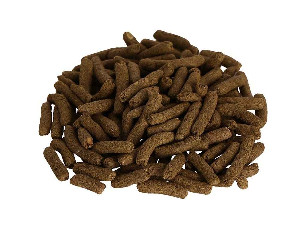 Složení: 25 % vojtěška, 20 % hrách, 12 % seno, 9 % oves, 6 % zeleniny (petržel stonky, mrkev), 5 % bylinky (brusinka, meduňka, máta, rozmarýn, kopřiva), slunečnicové šlupky, ječmen, sušený šípek, sušená jablka, len, uhličitan vápenatý, ostropestřec mariánský, monocalcium-fosfát, chorid sodný, extrakt z juky schidigera.
