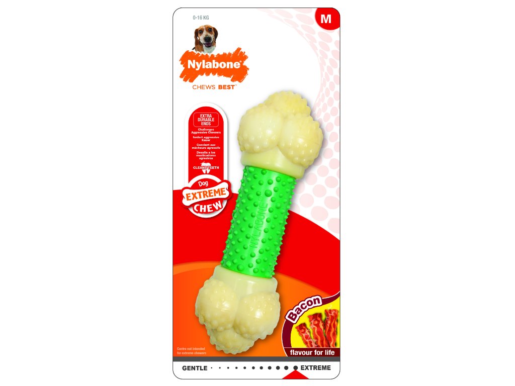Hračka Extreme Chew je navržena pro psy se silným skusem. Hrbolky pomáhají čistit zuby a redukují tvorbu plaku a zubního kamene během žvýkání. Hračka uspokojuje přirozenou potřebu žvýkání a řeší problém s agresivním kousáním. Žvýkací hračku si váš pes brzy oblíbí mimo jiné díky lahodné příchuti slaniny.