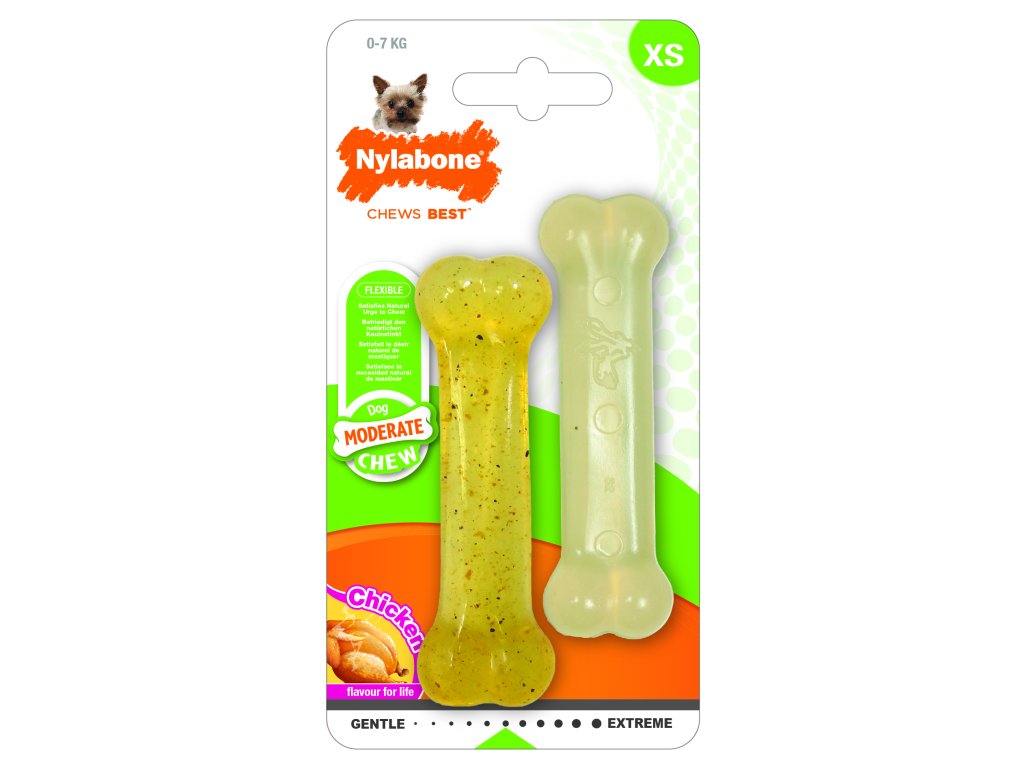Hračka ve tvaru kosti, kterou se zavděčíte každému psovi. Hračka je vyráběna pro jemnější žvýkání, tudíž je určená především pro malé psy nebo štěňata. Díky svému materiálu a příchuti uspokojují přirozenou potřebu žvýkání každého menšího psího mazlíčka. Balení se skládá z 2 kostí s příchutí kuřecího masa. Hračka vašeho pejska nejen na dlouho zabaví, ale také mu bude chutnat.