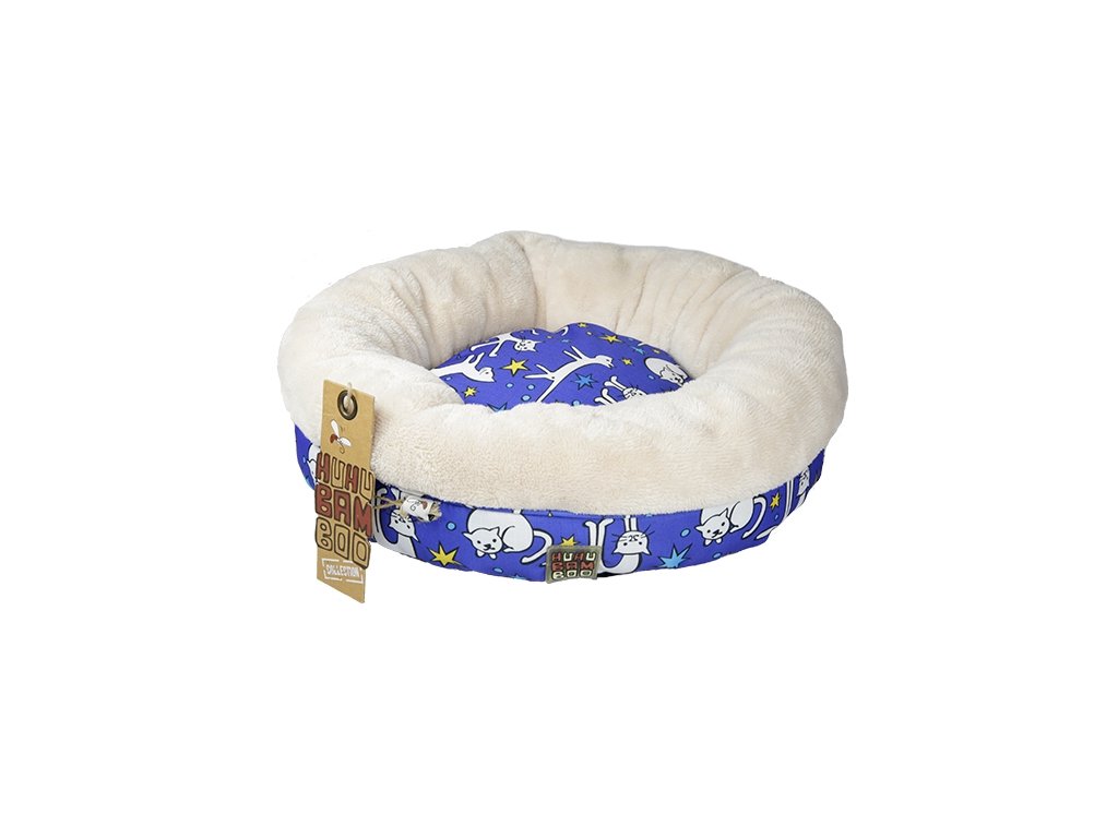 Huhubamboo Cat pelech ve tvaru americké koblihy s motivem kočky v modrém provedení. Tento luxusní pelíšek pro kočky splňuje i ty nejnáročnější požadavky.