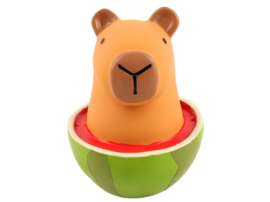Huhubamboo latexová kapybara s melounem. Rozměry hračky jsou 75x75x90 mm.