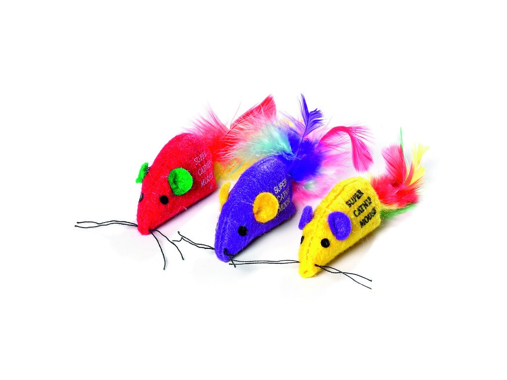 Plstěné myšky od firmy Karlie voní šantou, kočičí mátou, neodolatelnou vábničkou pro každou kočku. Žlutá, modrá a červená myška mají barevná peříčka místo ocásku a černé fousky.