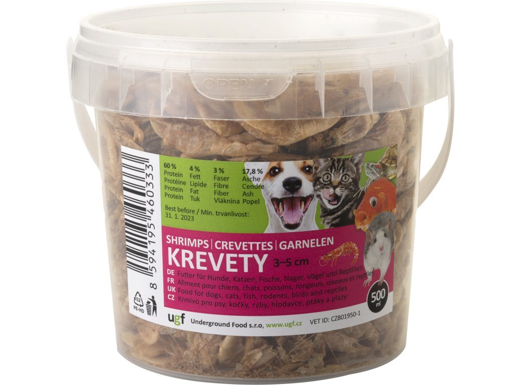 Sušené krevety jsou 100% přírodním doplňkovým krmením určeným pro psy, kočky, plazy, ryby (zejména KOI kapry), ptáky a hlodavce. Velikost krevet 3–5 cm.