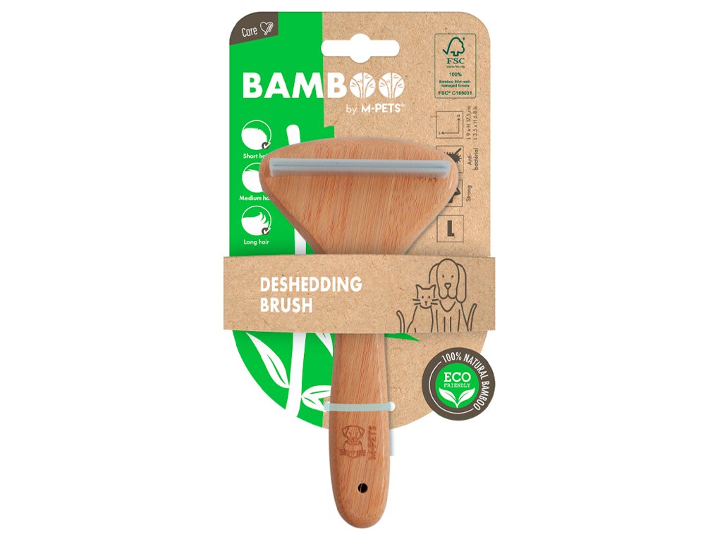 Přírodní bambusová rukojeť vám pomůže udržet pohodlný a bezpečný úchop při vyčesávání hustých a zauzlovaných kousků srsti. Zuby z nerezové oceli, vyrobené z vysoce kvalitních materiálů, jsou navrženy tak, aby šetrně odstraňovaly přebytečnou srst a nečistoty bez poškrábání citlivé kůže.