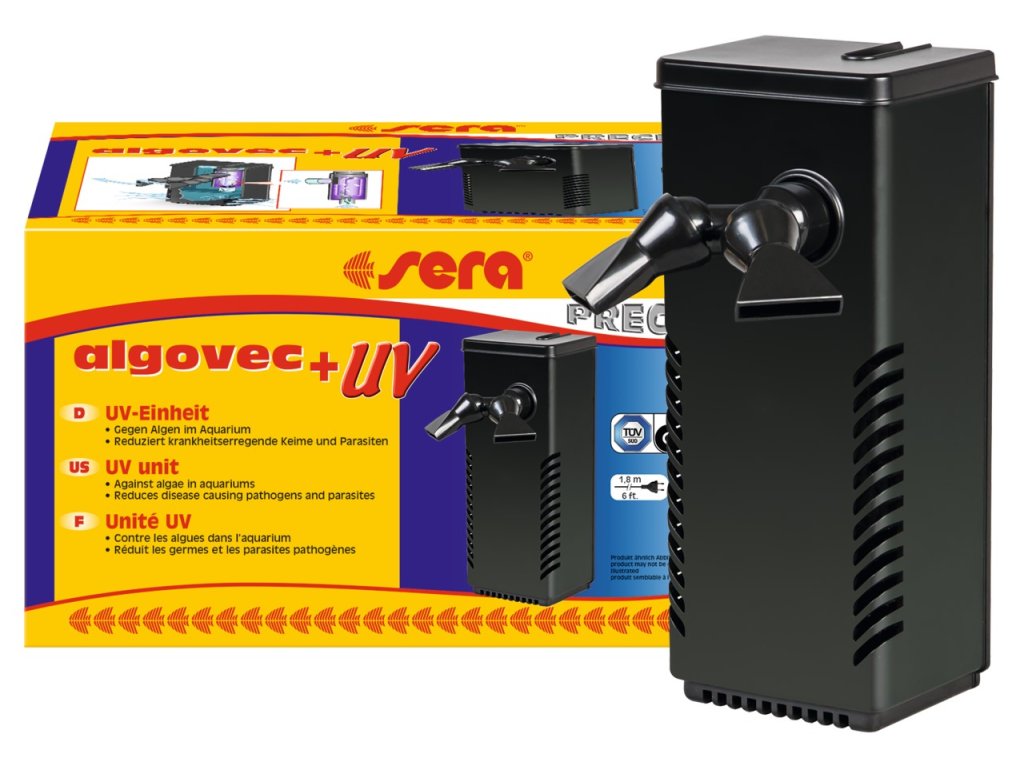 Sera algovec UV je inovativní UV-C-jednotka, která snižuje fyzikálním způsobem růst řas, zárodky a parazity a lze ji použít jako doplněk k existujícímu biofiltru. Integrované čerpadlo nasává vodu bočními štěrbinami tak, aby byla uvnitř čištěna UV-C zářením a to zcela bez chemikálií. Dodané čerpadlo FP 350 (max. 350 l/h, 6 W) je obzvlášť energeticky úsporné a výkon může být individuálně nastaven. Y-rozdělovač umožňuje variabilní nastavení směru proudění. Dodávané přísavky umožňují snadné uchycení sera algovec UV (kolmo nebo vodorovně) na stěnu akvária. Sera algovec UV systém je vhodný pro akvária do 100 l. Obsahuje Sera filtrační a napájecí čerpadlo FP 350, Sera UV-C systém 5 W včetně transformátoru a předřadiče, nastavitelný Y-rozdělovač.