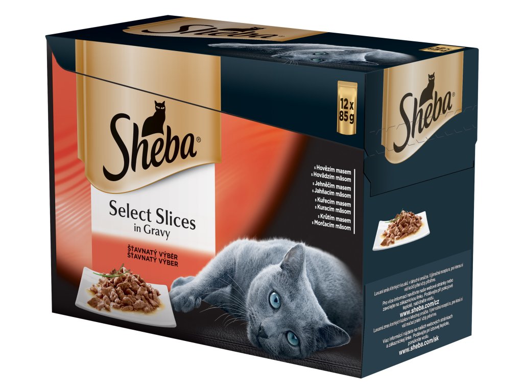 Luxusní směs křehkých kousků v lahodné omáčce, to je Sheba Select Slices in Gravy, kompletní krmivo pro dospělé kočky.